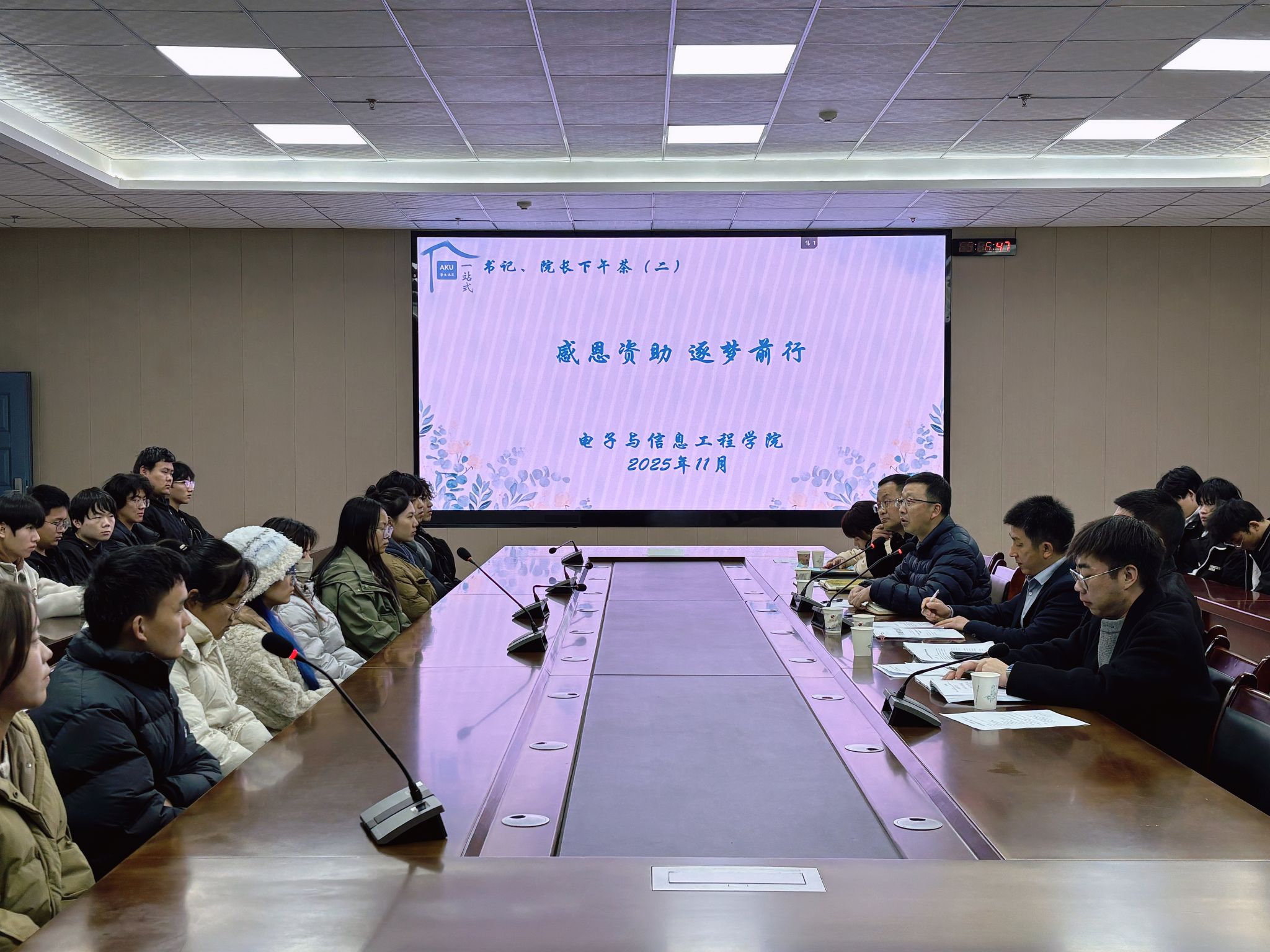 11 月 26 日下午,bwin官网在逸夫科技楼 9 楼大会议室举办 “书记院长下午茶” 系列活动(二)——“励志逐光,聚力同行” 国家助学金学生座谈会。活动紧扣国家助学金政策要求,搭建学院与受助学生的深度沟通桥梁,学院党政班子成员、学工办人员及 2023-2025 级 60 余名获助学生代表参会,党总支副书记蔡正旺主持会议。