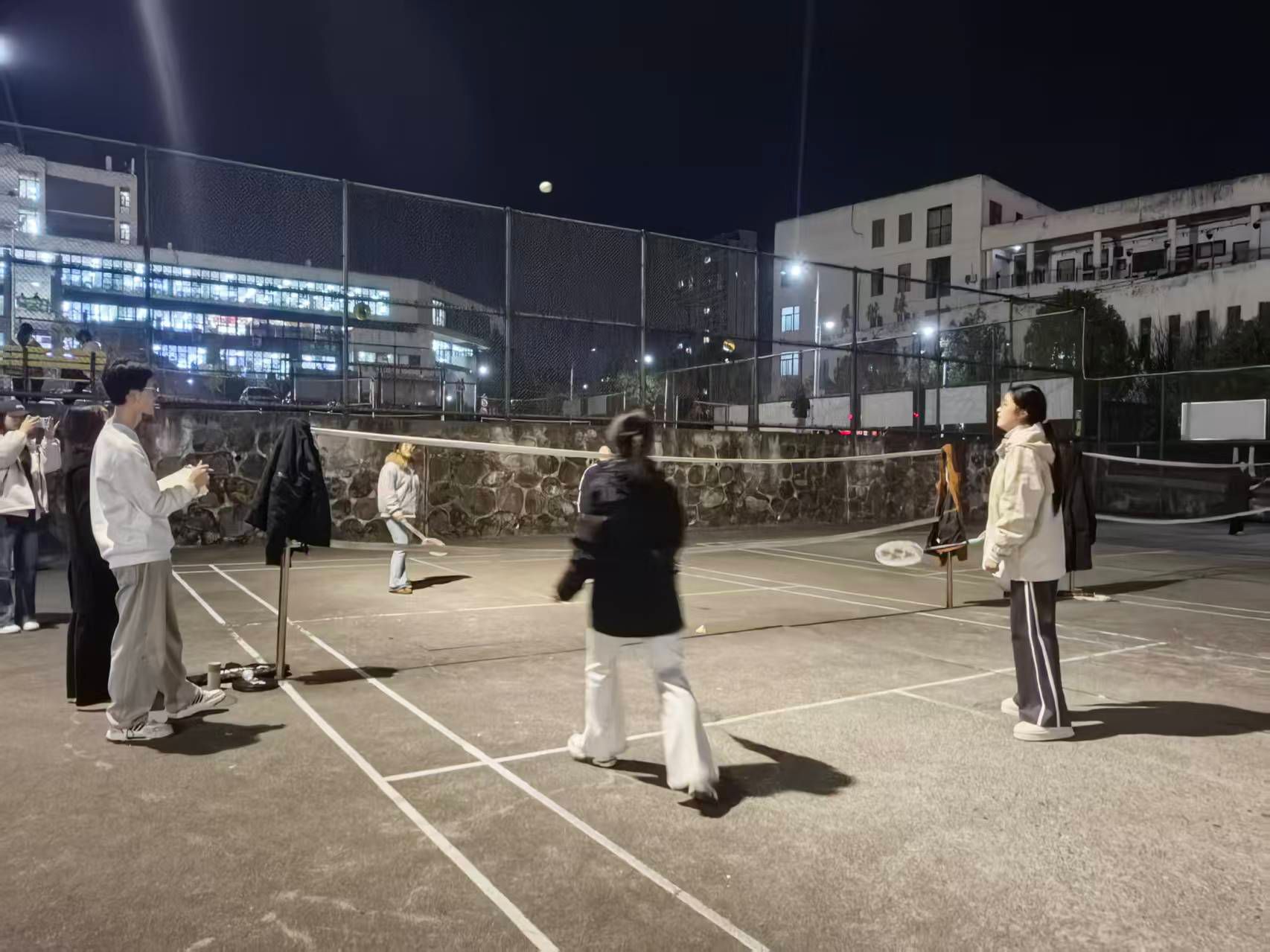 另一边的羽毛球场上,女生宿舍的双打组合同样亮眼:发球的精准落点、吊球的巧妙弧度、网前的快速截击,扣杀的凌厉气势,动作间的无缝衔接,皆是日常相处中沉淀的默契。场边记录比分的同学纸笔不停,观战的室友们举着手机抓拍精彩瞬间,时不时为一记漂亮的扣杀欢呼。