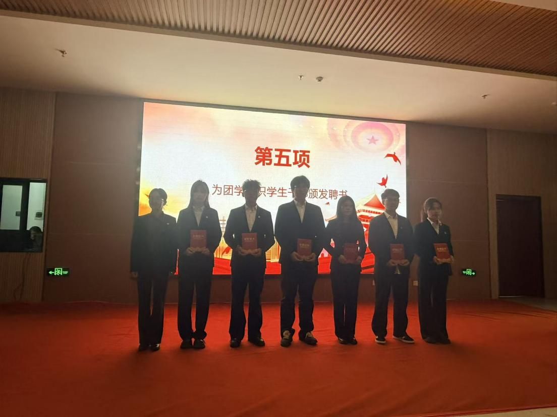 在全场的热烈掌声中,大会迎来了聘书颁发与授牌仪式。田静、成英丽、张宇航、翟子轩、贾金兵分别团学组织干部颁发聘书,一张张崭新的聘书不仅是身份的象征,更是责任的传递,39名团总支干部、31名学生会干部、6名社团服务中心干部接过了服务学院、服务同学的“接力棒”。授牌仪式结束后,学生分会轮值主席孙志豪带领第38届团总支、学生会全体成员庄严宣誓,铿锵有力的誓言彰显了新一届学生干部的担当与决心。