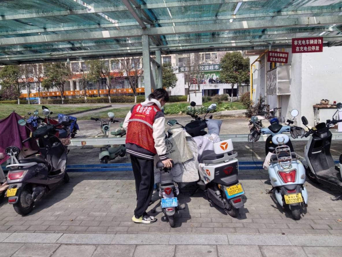 活动现场,志愿者们身着统一的红色志愿马甲,以分组分片的方式,对校园内的电动车停放情况开展全面巡查与规范整理。在充电棚内,志愿者们耐心调整车辆摆放位置,将乱停乱放的电动车逐一移至指定车位,切实保障充电位规范使用、不被占用;在校园道路旁,志愿者们主动上前,对电动车违规停放的车主进行耐心劝导,细致讲解乱停乱放对校园通行秩序、消防安全带来的不良影响,向过往师生积极宣传文明停车、绿色出行的重要意义;针对无人认领的违规停放车辆,志愿者们在确保车辆安全的前提下,将其规范移至指定停放区域,并张贴温馨提示提醒车主。